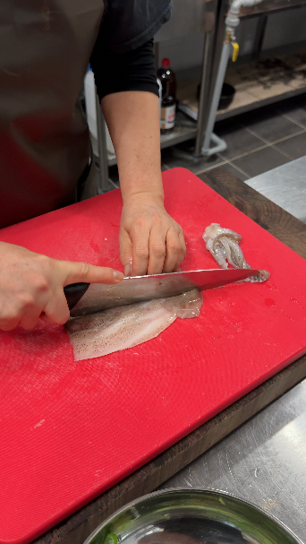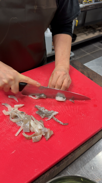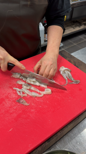 5) 오징어는 반으로 갈라서, 얇게 슬라이스 해주세요!